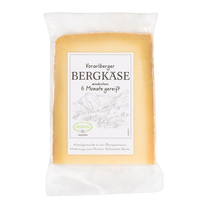 Vorarlberger Bergkäse ist eine regionale Spezialität aus Hinteregg und schmeckt feinwürzig. Der Käse durfte 6 Monate reifen und dabei sein Aroma entwickeln.
