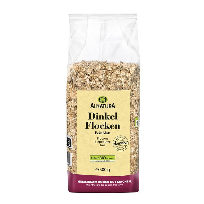 Die Alnatura Dinkelflocken stammen aus biologisch-dynamischer Landwirtschaft. Durch ihren mild nussigen Geschmack und die feine Konsistenz sind sie eine hervorragende Müslibasis und eignen sich auch als Zutat für Brot, Brötchen, Kuchen und Gebäck.
