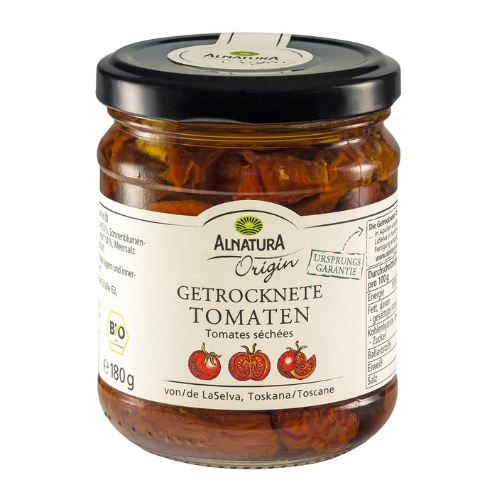 Zur Verfeinerung von Pasta- und Fischgerichten, als Antipasti: Diese Tomaten werden im sonnenverwöhnten Apulien angebaut, vollreif geerntet und in der Sonne getrocknet. Auf dem Hofgut LaSelva werden die handverlesenen Früchte schonend verarbeitet: in einem aromatischen Mix aus Sonnenblumenöl und Olivenöl extravergine eingelegt, rundet man den Geschmack mit einer Prise Meersalz ab.