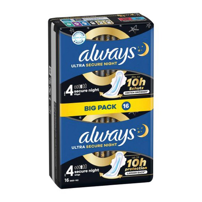 Gib dich nicht mit nicht weniger zufrieden als mit einem guten Schlaf mit bis zu 10 Std. Schutz: Always Ultra Secure Night (Größe 4) Damenbinden mit Flügeln und saugstarker und weicher Oberfläche sind mit 3 Schutzfunktionen ausgestattet, damit du nicht mitten in der Nacht aufwachst, um das Auslaufen zu überprüfen oder deine Binde wechseln zu müssen. Eine 60% größere Rückseite (im Vergleich zu Always Ultra Normal Größe 1) in Kombination mit unserer LeakGuard-Technologie sorgen für Rumdum-Schutz, um Auslaufen während der Periodennächte zu vermeiden. Always Ultra Binden sind von der Skin Health Alliance dermatologisch bestätigt.