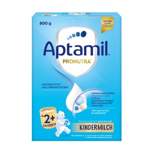 Füllhöhe technisch bedingt. Unter Schutzatmosphäre verpackt. Aufbewahrungshinweis: Angebrochenen Innenbeutel stets gut wieder verschließen und innerhalb von vier Wochen aufbrauchen. Vor Wärme geschützt und trocken lagern. Originalverschlossen mindestens haltbar bis: Siehe Packungsunterseite. Nach Anbruch kann die Packung durch Einschieben der Lasche in den Schlitz wieder verschlossen werden. Ernährungsexperten empfehlen für Kleinkinder täglich ca. 300-330 ml Milch und Milchprodukte. Aptamil® Kindermilch 2+ eignet sich für Kleinkinder ab 2 Jahren als Milchgetränk zum Frühstück, Mittagessen, Abendessen oder zwischendurch. Unsere Kindermilch schmeckt warm oder kalt. Trinkmenge und Anzahl der Portionen variieren individuell. Daher ist die angegebene Trinkmenge nur ein Richtwert. Bitte verwenden Sie nur den beiliegenden Messlöffel. Gestrichen voll fasst dieser 4,9 g Aptamil® Kindermilch 2+. Eine Packung entspricht ca. 54 Portionen zu je 100 ml trinkfertiger Kindermilch.