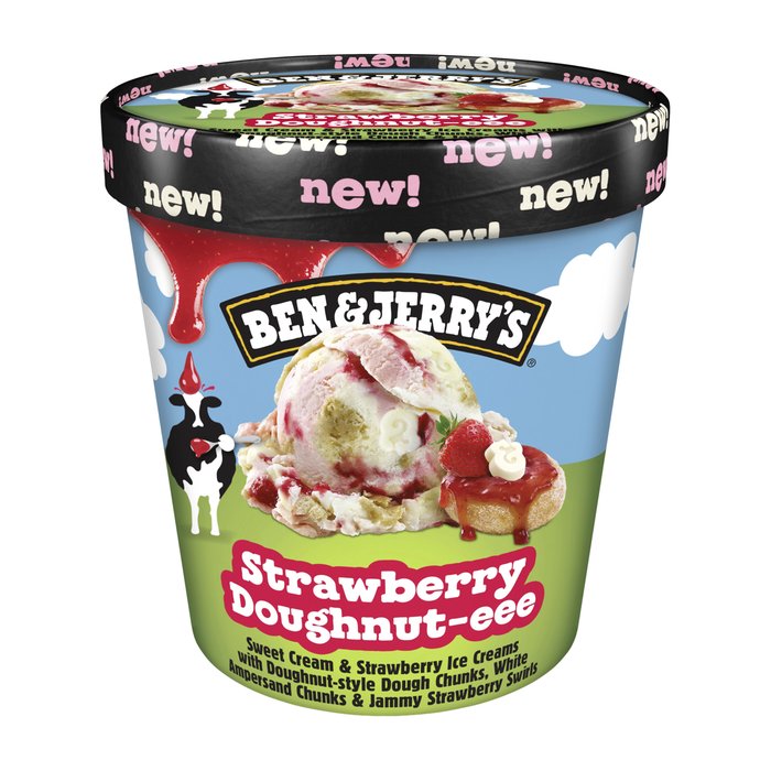 Eiscreme und Erdbeerfruchteiscreme mit Teig-Stücken mit Doughnut-Geschmack (6%) und weißen Fettglasurstücken (4,5%), durchzogen von Erdbeersauce (10%).