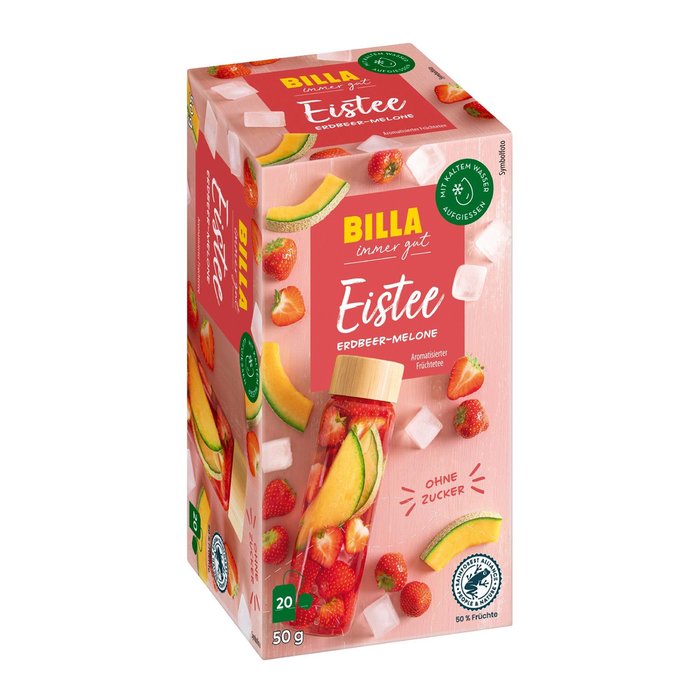 Die Billa Immer Gut Eistee in der fruchtigen Sorte Erdbeer-Melone ist die ideale sommerliche Erfrischung - ganz ohne Zucker. Teebeutel einfach mit kaltem Wasser aufgießen, 8 Minuten ziehen lassen und nach Belieben mit Eiswürfel genießen.