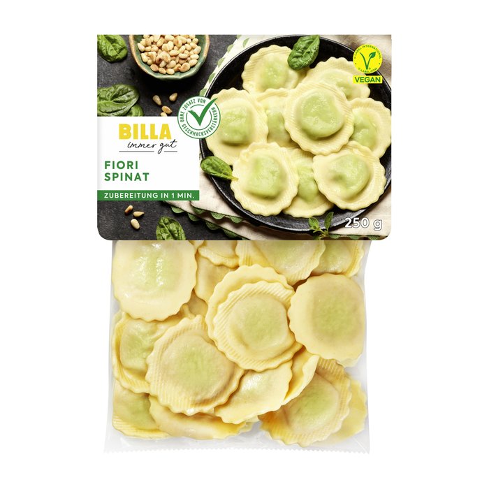 Zutaten: HARTWEIZENGRIESS, Wasser, 16% Blattspinat, veganer Aufstrich (Wasser, Kokosnussöl, Stärke, Zucker, Erbsenprotein, Speisesalz, Reifungskulturen, Säuerungskulturen), Kartoffeln, Reismehl, Zwiebeln, Speisesalz, 0,6% Pinienkerne, Rapsöl, Gewürze, Kräuter, Gewürzextrakte.