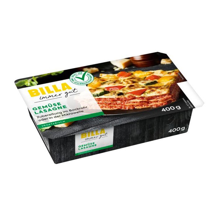 Das Backrohr vorheizen (Ober- und Unterhitze 190°C, Umluft 190°C). Die tiefgekühlte Lasagne in der Schale (ohne Deckel) in die Mitte des Backrohrs auf den Rost platzieren und ca. 35-40 Minuten backen. Bei an-/aufgetauter Lasagne verringert sich die Zubereitungszeit.
