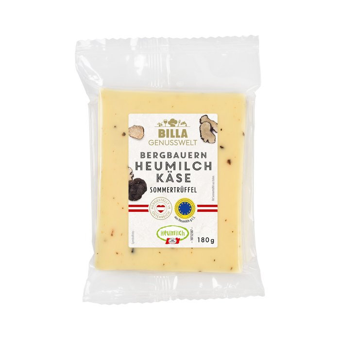 Zutaten: HEUMILCH g.t.S., 1,5% Sommertrüffelzubereitung (63% Sommertrüffel, Wasser, Speisesalz, Aroma), unjodiertes Speisesalz, tierisches Lab, Käsereikulturen