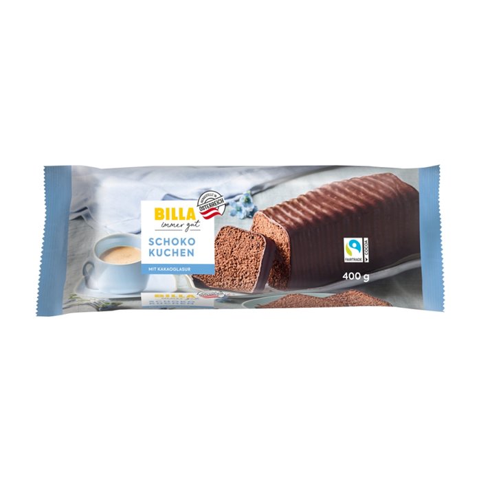 Rührkuchen mit 2,5% Zartbitterschokoladentröpfchen, überzogen mit 10% kakaohaltiger Fettglasur