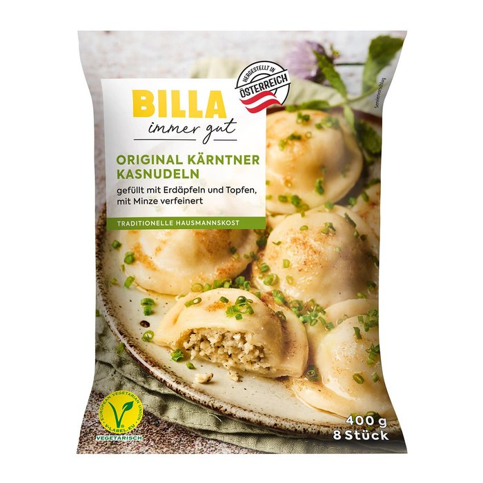 Die tiefgekühlten Nudeln mit etwas Wasser benetzten, zugedeckt pro Portion (4 Stück) 3 bis 4 Minuten bei voller Leistung garen. Danach in heißer Butter schwenken