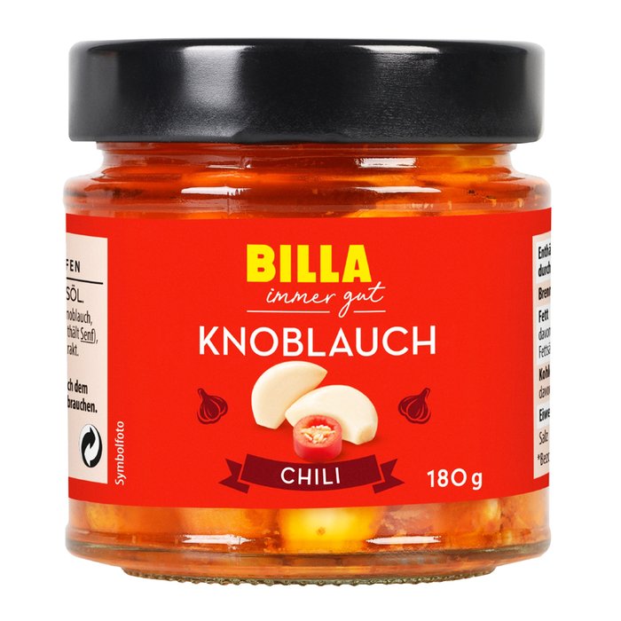 ZUTATEN: eingelegte Knoblauchzehen 64 % (Knoblauch, Salz, Weingeistessig), Rapsöl, Salz, Gewürze (enthält SENF),