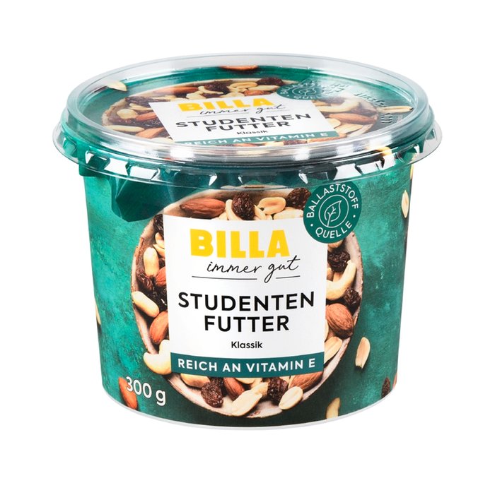 Das BILLA immer gut Studentenfutter Klassik ist die perfekte Mischung aus Nüssen und Trockenfrüchten - ein Energiesnack für zwischendurch! Dieser eignet sich auch ideal zum Verfeinern von Müslis und Joghurt.