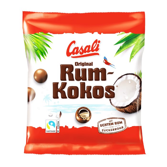 Zutaten: Zucker, Kakaobutter, VOLLMILCHPULVER, Kakaomasse, SÜßMOLKENPULVER, Rum (4%), Kokosraspel (4%), HAFERMARK, Aromen, Emulgator: Lecithine (SOJA); Überzugsmittel: Gummi arabicum, Schellack; Glukose-Fruktosesirup, Gelatine, Stärke. Kann Spuren von Nüssen enthalten.