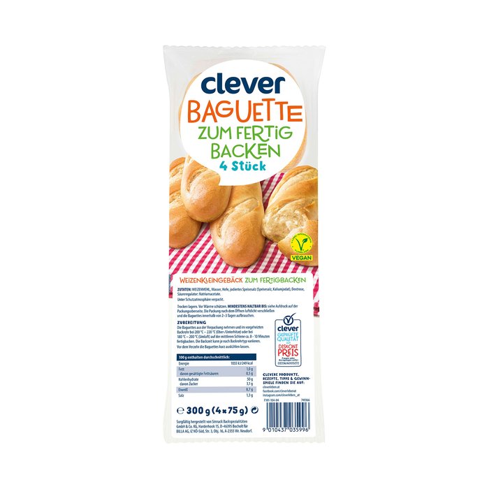 Die Baguettes aus der Verpackung nehmen und im vorgeheizten Backrohr bei 200-220° (Ober- /Unterhitze) oder bei 180-200°C (Umluft) auf der mittleren Schiene ca. 8-10 Minuten fertigbacken. Die Backzeit kann je nach Backrohrtyp variieren. Vor dem Verzehr die Baguettes kurz auskühlen lassen.