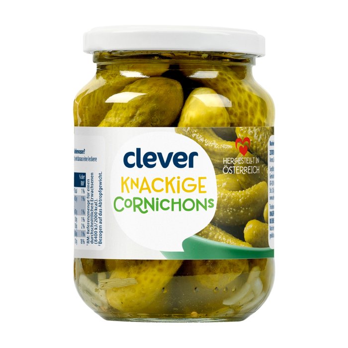 Zutaten: Gurken, Salz, Säuerungsmittel: Essigsäure; natürliches Aroma, Süßungsmittel: Saccharin; SENFKÖRNER