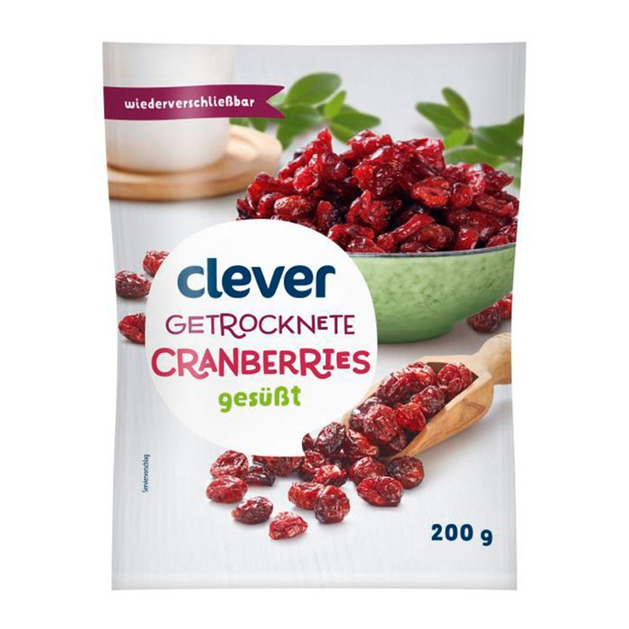 Zutaten: Cranberries getrocknet 66%, Zucker 33%, Sonnenblumenöl.