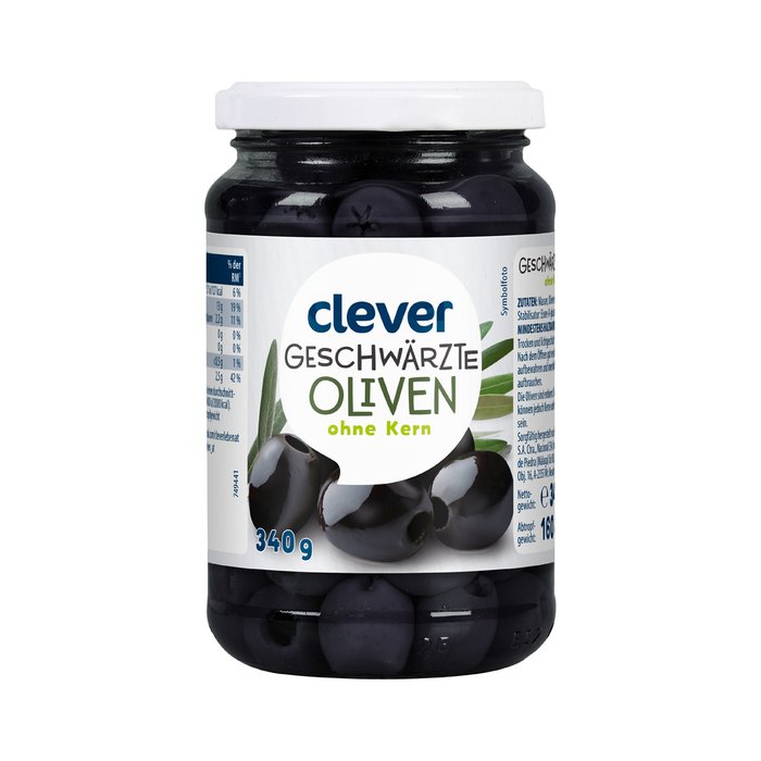 Zutaten: Wasser, Oliven entkernt, Salz, Stabilisator: Eisen-II-gluconat.