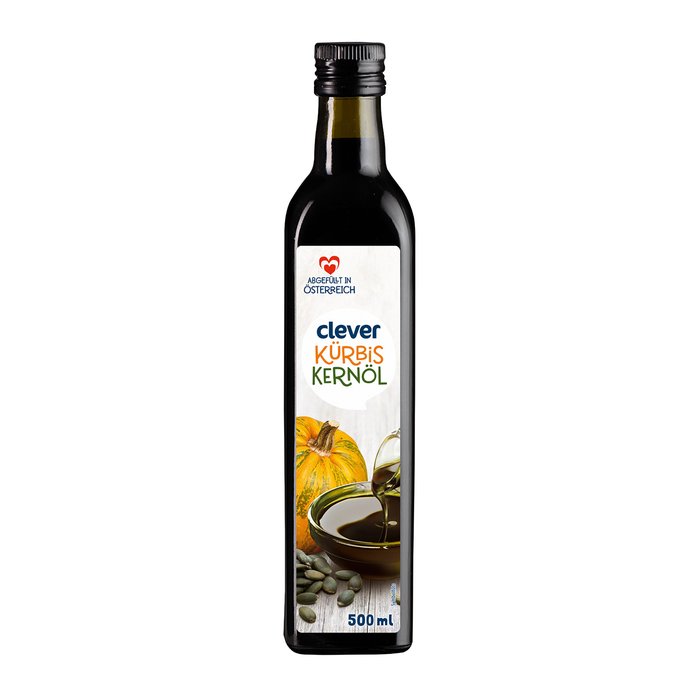 Das clever Kürbiskernöl wird durch das Pressen von gehackten und gerösteten Samen hergestellt und in Österreich abgefüllt. Es erhält dadurch seinen typisch nussigen und hocharomatischen Geschmack. Es eignet sich perfekt zum Marinieren von Salaten oder für kalte und warme Vor-, Haupt- und Nachspeisen.