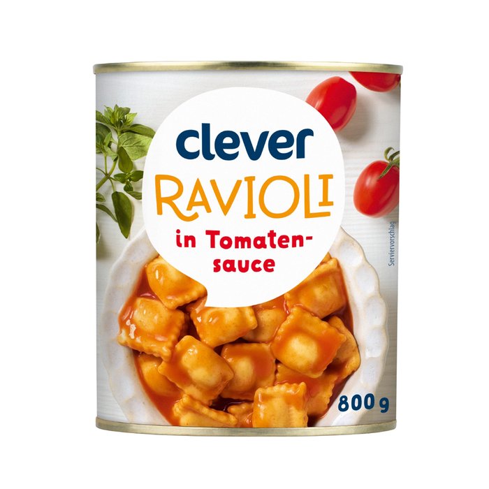 Zutaten: 52 % Ravioli [HARTWEIZENGRIEß, Wasser, Semmelbrösel (WEIZENMEHL, Wasser, Salz, Hefe), Rindfleisch (3,2 %), Karotten, Zwiebeln, Sonnenblumenöl, Salz, natürliche Aromen, Gewürze], 48 % Tomatensauce [Wasser, Tomaten (28 %), Zucker, modifizierte Stärke, Salz, Weingeistessig, natürliche Aromen (enthält SELLERIE), Gewürze].