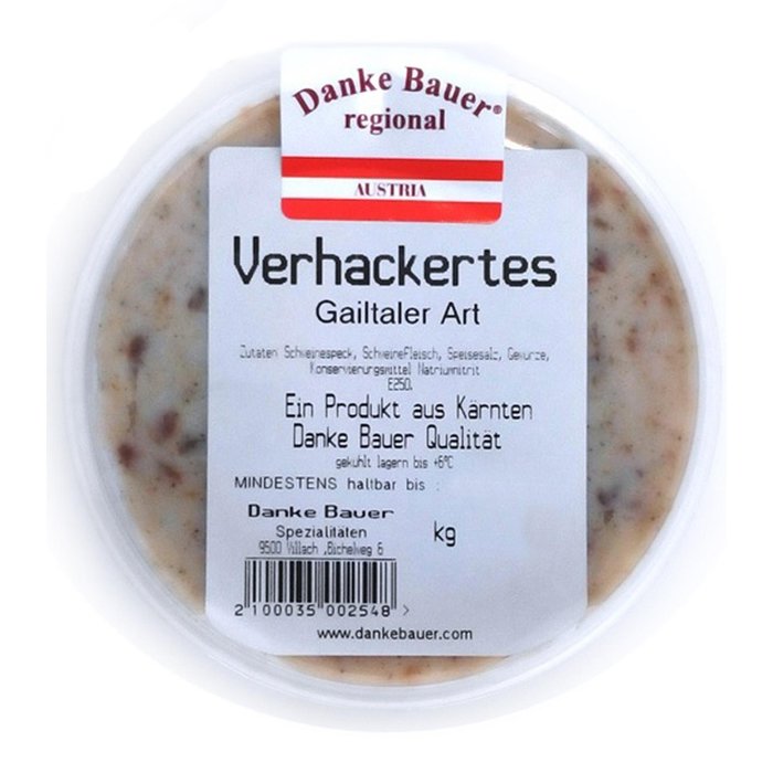 Zutaten: Schweinespeck 65% (Primärzutat aus Österreich), Schwein- und Rindfleisch 32%, Trinkwasser, Speisesalz, Konservierungsstoff E250 E202, Gewürze, Knoblauch, Antioxidationsmittel E300, Rauch