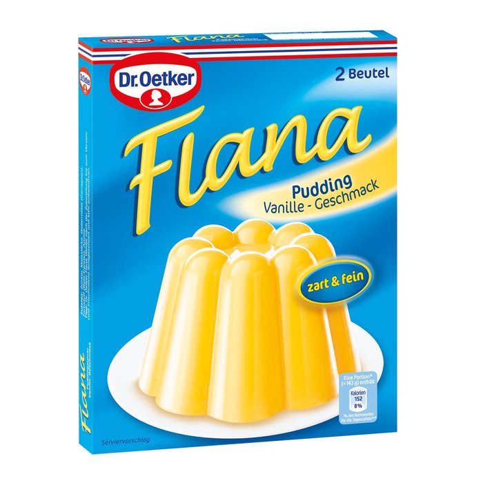 Zubereitung von 4 Dessertportionen mit 1 Beutel Flana und 1/2 l Milch: 1. Puddingpulver (1 Beutel) mit ca. 50 g Zucker (ca. 3 EL) mischen. Mit 3 EL der vorbereiteten Milch glatt rühren. 2. Übrige Milch aufkochen, von der Kochstelle nehmen und angerührtes Pulver einrühren. 3. Pudding unter Rühren mindestens 1 Minute kochen. Hinweis: Flana bleibt beim Kochen dünnflüssig und lässt sich so einfacher in Formen füllen! 4. Flana in eine Schale oder kalt ausgespülte Sturzform füllen. Zum Stürzen mindestens 3 Stunden in den Kühlschrank stellen. Hinweis: Dr. Oetker Flana Vanille-Geschmack nach der Zubereitung bis zum Verzehr (wie Frischmilch) lichtgeschützt und kühl lagern.