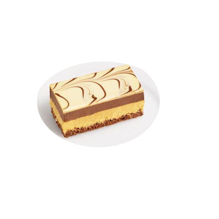 Pistaziencreme mit knusprig gerösteten Weizenteigfäden auf dunklem Biskuit, mit Bitterschokoladenganache und Glasur