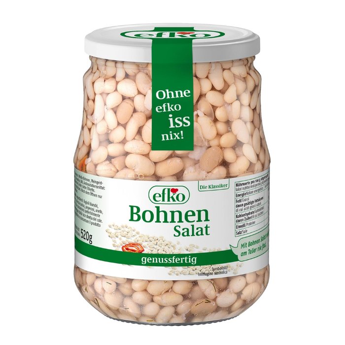 Zutaten: Weiße Bohnen, Weingeistessig, Zwiebel, Zucker, Speisesalz, Paprika, Dill, Antioxidationsmittel: Ascorbinsäure.