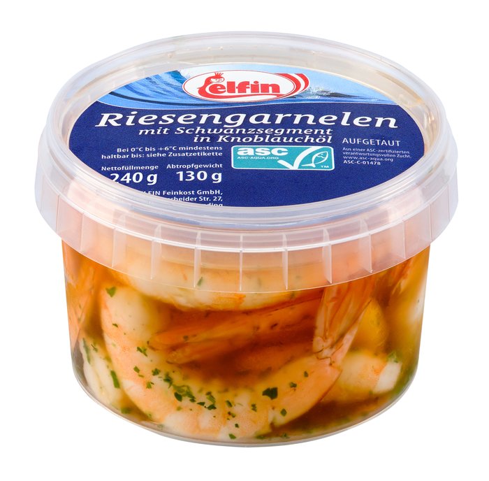 Zutaten: GARNELEN (52%), Sonnenblumenöl, Speisesalz, Säuerungsmittel: Citronensäure, Weinsäure, Apfelsäure, L-Ascorbinsäure, Kräuter, natürliches Knoblauch-Aroma, Konservierungsstoff: E200, E211. Kann Spuren von SULFIT enthalten.