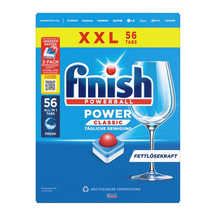 Tab auspacken. 1 Tab pro Spülgang in die TROCKENE Dosierkammer legen. Nicht in den Besteckkorb legen. Für beste Ergebnisse das ECO-/Auto-Programm anwenden. Sollte der Tab nicht in die Dosierkammer passen, lesen Sie die Gebrauchsanweisung Ihrer Geschirrspülmaschine oder konsultieren Sie Ihren Spülmaschinenhersteller. In Kurzspülgängen den Finish Power Classic Tab auf dem Boden des Geschirrspülers platzieren, idealerweise in der Nähe des Filters. Die integrierte Salzfunktion ist bei weichem/mittlerem und hartem Wasser bis zu 21 °dH wirksam. Wenn Ihr Wasser sehr hart ist, verwenden Sie zusätzlich Finish Spezial-Salz. Für die Verwendung in Haushalten mit Klärgrubensystemen geeignet. Diese Verpackung ist recycelbar. Bitte leere Verpackung im Recyclingmüll entsorgen. Verpackung nur restentleert der Wertstoffsammlung zuführen. Für optimale Trocknungsergebnisse empfehlen wir den Finish Glanz- & Klarspüler. Nicht empfohlen für die Verwendung mit echtem Silberbesteck.