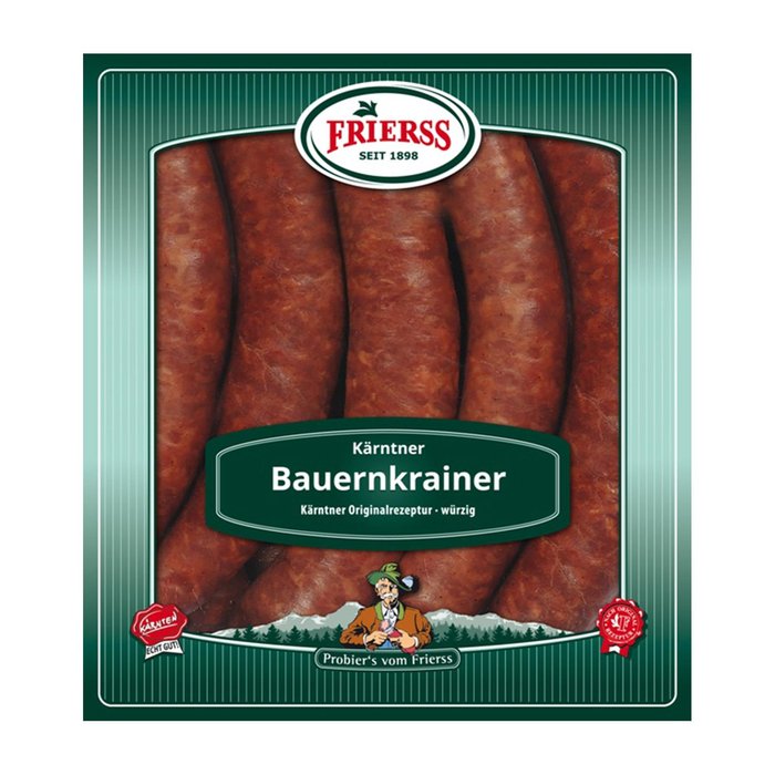 Die Kärntner Bauernkrainer werden nach Kärntner Tradition aus bestem heimischen Schweinefleisch gefertigt. Sorgfältig kalt geräuchert, überzeugen Sie Kenner nach dem Kochen mit delikatwürzigem Geschmack. Die Kärntner Bauernkrainer gelten vor allem zu Ostern und zu Weihnachten als traditionelle Spezialität.