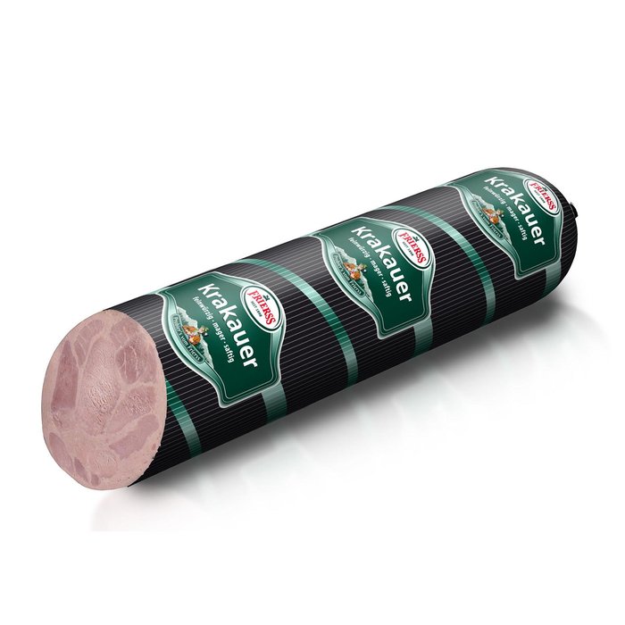 Zutaten: 80% Schweine- und Rindfleisch, Trinkwasser, Nitritpökelsalz (Speisesalz, Konservierungsstoff: Natriumnitrit), Stärke, Dextrose, Gewürze (enthält SENF) und Gewürzextrakte, Weinextrakt, Zucker, Stabilisator: Di,- Tri- und Polyphosphate, Geschmacksverstärker: Mononatriumglutamat, Antioxidationsmittel: Ascorbinsäure, Natriumascorbat; Würze, Aroma, gekocht.