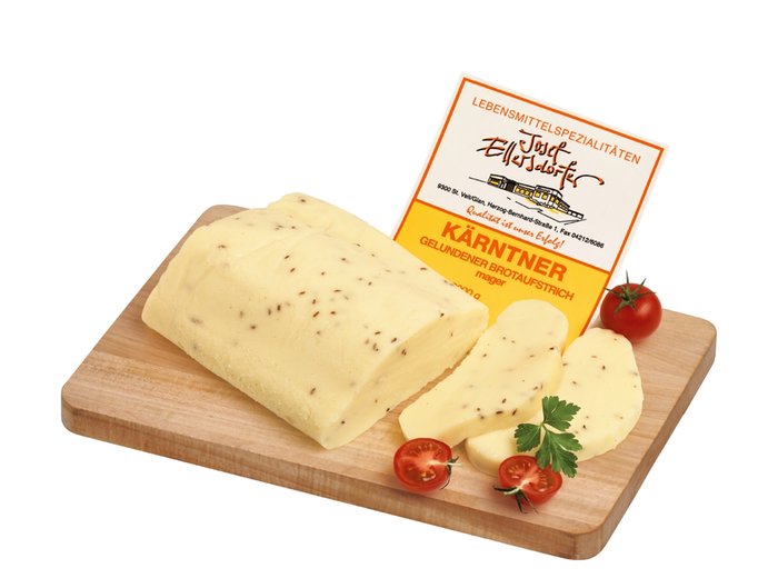Zutaten: MAGERTOPFEN, Wasser, BUTTER, Gelatine, Maisstärke, Speisesalz jodiert, Kümmel, Gewürze, Schmelzsalz: Natriumphosphate