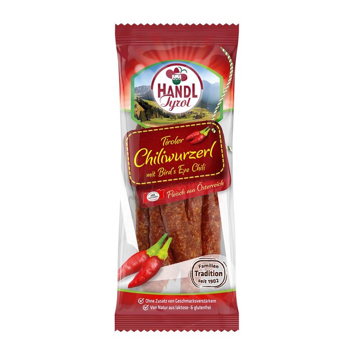 Traditionell hergestellt für die Fans feuriger Schärfe: Die Kaminwurzerl extra scharf von Handl Tyrol sind kalt geräuchert und begeistern mit feiner Würzung.