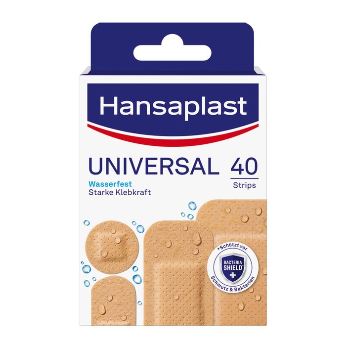 Die Water Resistant Pflaster von Hansaplast sind atmungsaktiv und wasserabweisend. Die Packung enthält einzeln verpackte Streifen in vier Größen.