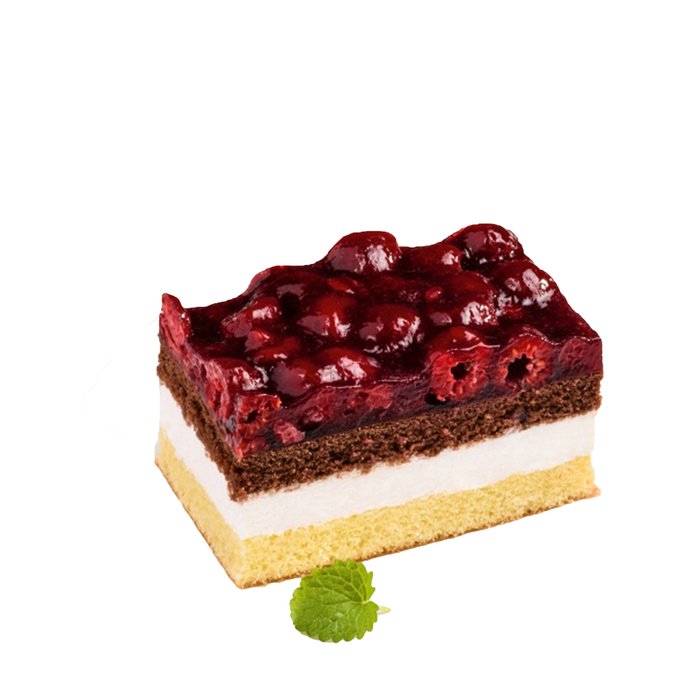 Topfenhaltige Creme (34%) zwischen hellem und dunklem Rührteigboden, mit Himbeeren belegt und Tortenguss überzogen