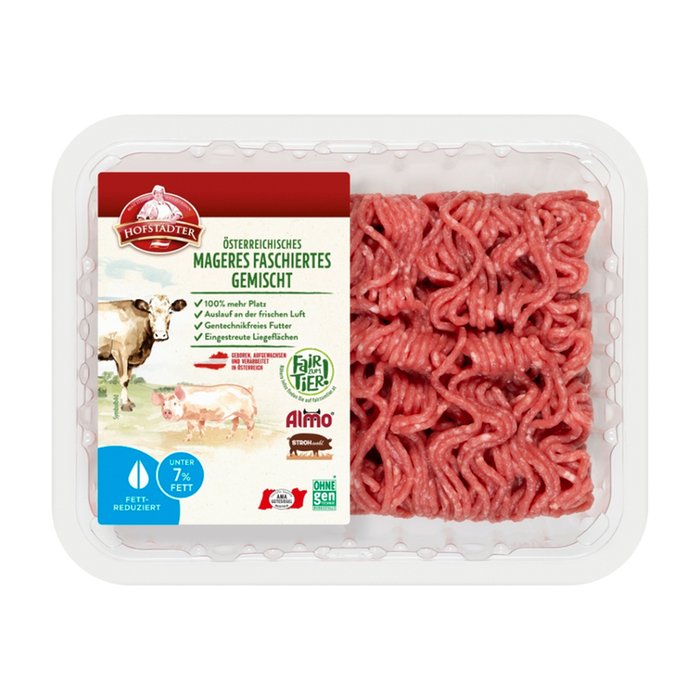 Mindestens 65% weniger Fett als herkömmliches gemischtes Faschiertes mit 20% Fett.