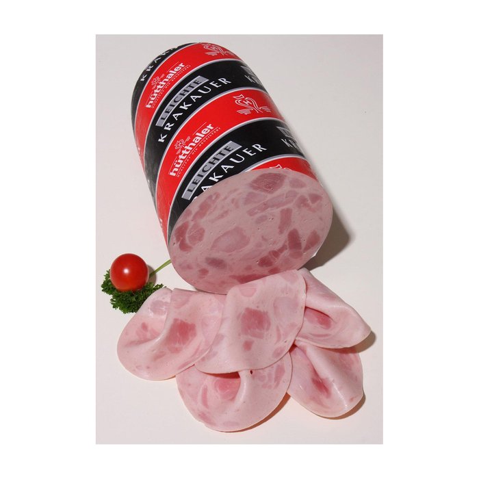 Zutaten: Schweine- & Rindfleisch (86%), Wasser, Speisesalz, Säuerungsmittel: Natriumlaktat; Stabilisatoren: Di-, Tri- & Polyphosphate; Gewürzextrakte, Farbstoff: Karmin; Gewürze, Antioxidationsmittel: Ascorbinsäure, Natriumascorbat; Aroma, Maltodextrin, Konservierungsstoff: Natriumnitrit.
