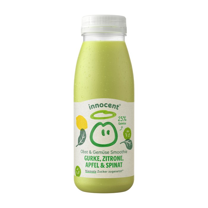 Zutaten: Apfelsaft (46%), Bananenpüree (17%), Zucchinisaft (10%), Chayoten-Püree (9,1%), weißes Guavenpüree (5,4%), Gurkenpüree (4,5%), Zitronensaft (3%), Apfelwasser (1,7%), Mandarinen-Fruchtfleisch (1,7%), Spinatpüree (1,7%), Spirulina-Extrakt (0,25%), Kurkuma-Extrakt (0,12%), Grüne Minze-Extrakt ( 0,01%).