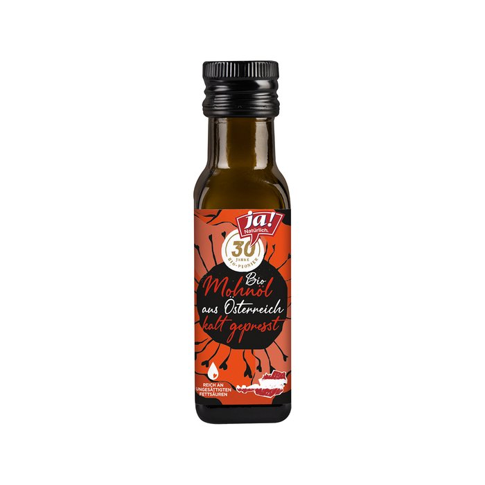 Das Ja! Natürlich Bio-Mohnöl nativ wird aus 100% österreichischen Bio-Mohn in der Steiermark schonend und kalt gepresst. Ohne die zusätzliche Erwärmung, Filterung oder Raffinierung bleiben seine wertvollen Inhaltsstoffe erhalten. Das Öl schmeckt süßlich und leicht nussig mit lieblichem Aroma. Es eignet sich wunderbar für Dressings und zum Verfeinern von Gemüse sowie Nachspeisen. Eine max. Aufnahme von 10 ml täglich wird empfohlen, da das Produkt Spuren von Opiumalkaloiden enthalten kann.