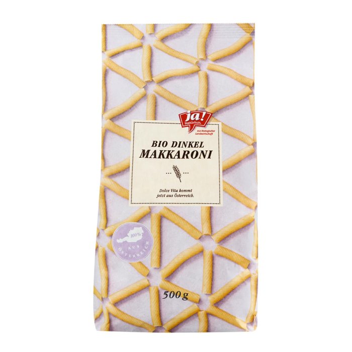 Bei den Ja! Natürlich Bio-Dinkel-Makkaroni handelt es sich um ein 100% österreichisches Bio-Produkt. Zur Herstellung wird hochwertiger, österreichischer Bio-Dinkelauszugsgrieß verwendet.