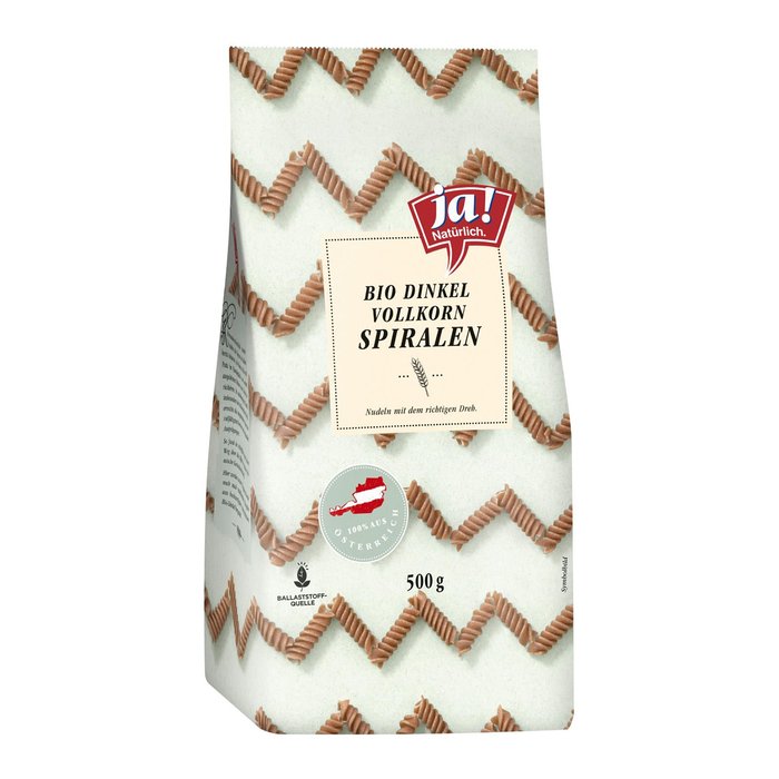 Die Ja! Natürlich Bio-Dinkelvollkorn-Spiralen werden aus 100 % österreichischen Bio-Dinkel hergestellt. Dieser wird extra schonend vermahlen und mit Wasser vermischt - Eier werden keine verwendet. Der Teig wird anschließend in Form gepresst und getrocknet. Durch das Dinkelkorn bekommt die Teigware ein feines, nussiges Aroma.