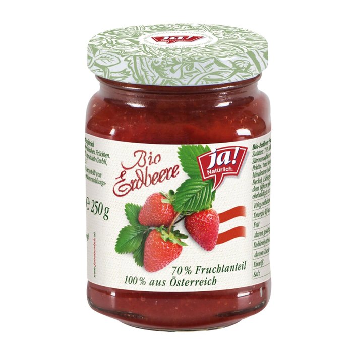 Die Erdbeeren für den Ja! Natürlich Fruchtaufstrich Erdbeere stammen ausschließlich aus Österreich. Der hohe Fruchtanteil von 70% macht sie zu einem besonderen Geschmackserlebnis. Die Früchte werden reif, zum optimalen Zeitpunkt geerntet, tiefgefroren und in einer Manufaktur nach traditioneller Rezeptur zu kostlichen Fruchtaufstrichen verarbeitet. Warum heißt unser Fruchtaufstrich oder unsere Konfiture extra nicht Marmelade? Das EU-Kennzeichnungsgesetz schreibt vor, den Begriff 'Marmelade' ausschließlich bei Zitrussorten zu verwenden. Bei Konfiture und Konfiture extra hingegen sind Fruchtanteil und Zuckergehalt genau geregelt: Eine Konfiture extra muss mindestens 45% Fruchtanteil haben. Und weil wir bei unseren Sorten Marille und Erdbeere einen hoheren Fruchtanteil haben als bei Konfiture oder Konfiture extra, mussen wir sie Fruchtaufstrich nennen.