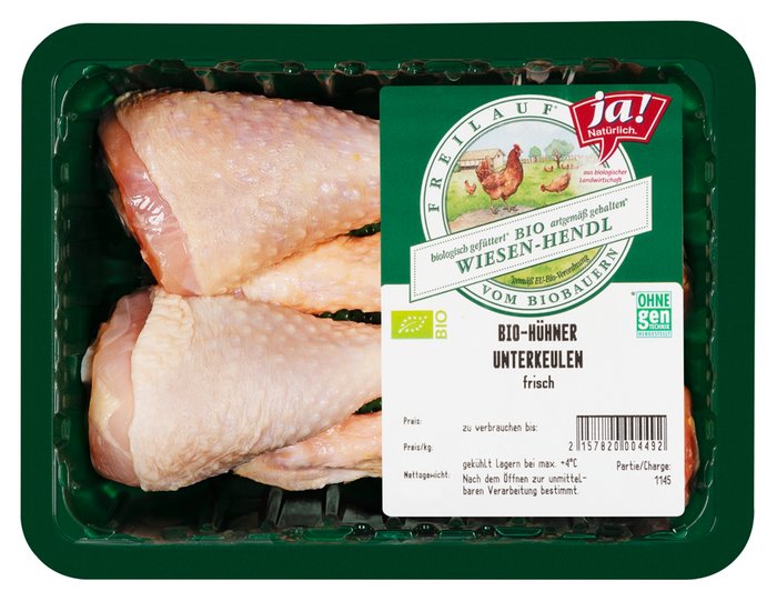 Die Unterkeulen vom Bio-Wiesenhendl sind dem Fleisch der Oberkeule ähnlich, jedoch etwas stärker mit Sehnen durchzogen und geschmacklich intensiver. Die Bio-Keulen machen sich geschmort besonders gut. Unsere Bio-Wiesenhendln haben viel Auslauf in der freien Natur und freuen sich über 100% Bio-Futter aus Österreich.