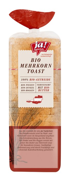 Das Bio-Getreide für den Ja! Natürlich Bio-Mehrkorntoast wird im Wald- und Weinviertel sowie im Burgenland angebaut. Die Getreidemischung aus Bio-Weizen, Bio-Dinkel und Bio-Roggen vereint mit feiner Bio-Butter aus Österreich sorgt für besonderen Genuss. Der Ja! Natürlich Bio-Mehrkorntoast schmeckt nicht nur zum Frühstück gut, er eignet sich auch hervorragend für Schinken-Käse-Toast und ungetoastet als Sandwich.