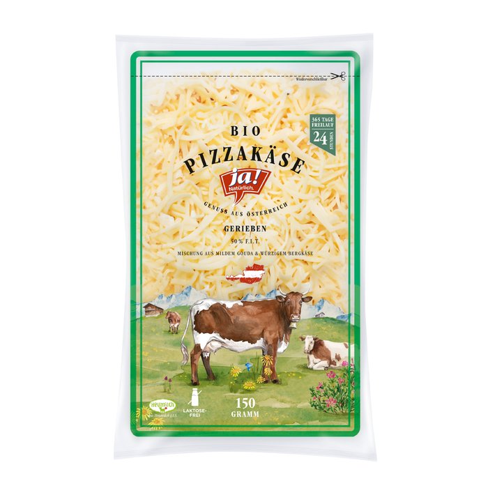 Der zart schmelzende Gouda bekommt durch etwas Bergkäse eine angenehme Würze - ideal für eine selbstgemachte Pizza oder Aufläufe. Im praktischen Standbeutel mit Wiederverschluss, bleibt der Ja! Natürlich Pizzakäse gerieben 150g länger frisch.