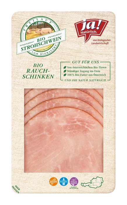 Das Fleisch für den Ja! Natürlich Bio-Rauchschinken stammt ausschließlich von österreichischen Bio-Bauernhöfen, auf denen die Tiere mit viel Bewegungs-Freiraum, Licht, Luft und Kontakt zu ihren Artgenossen gehalten werden. Die Verarbeitung bester biologischer Zutaten erfolgt in österreichischen Betrieben nach traditionellen Rezepten - selbstverständlich ohne Zugabe von Geschmacksverstärkern, Stabilisatoren, Aromen und Phosphat.