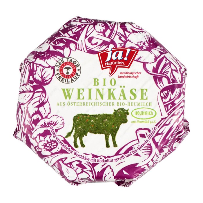 Der g'schmackige Ja! Natürlich Weinkäse stammt aus dem oberösterreichischen Alpenvorland, aus der einzig echten Klosterkäserei Europas - dem Stift Schlierbach. Der Weinkäse wird aus bester pasteurisierter Bio-Milch gekäst und während seiner Reifung regelmäßig mit Weingeläge und Rotwein affiniert. Dadurch erhält diese Käsespezialität seine unverwechselbare, fast schwarze Rinde, welche dem Käse seinen feinen Geschmack verleiht. Der Ja! Natürlich Weinkäse ist auch warm ein voller Genuss, einfach im Rohr kurz überbacken.