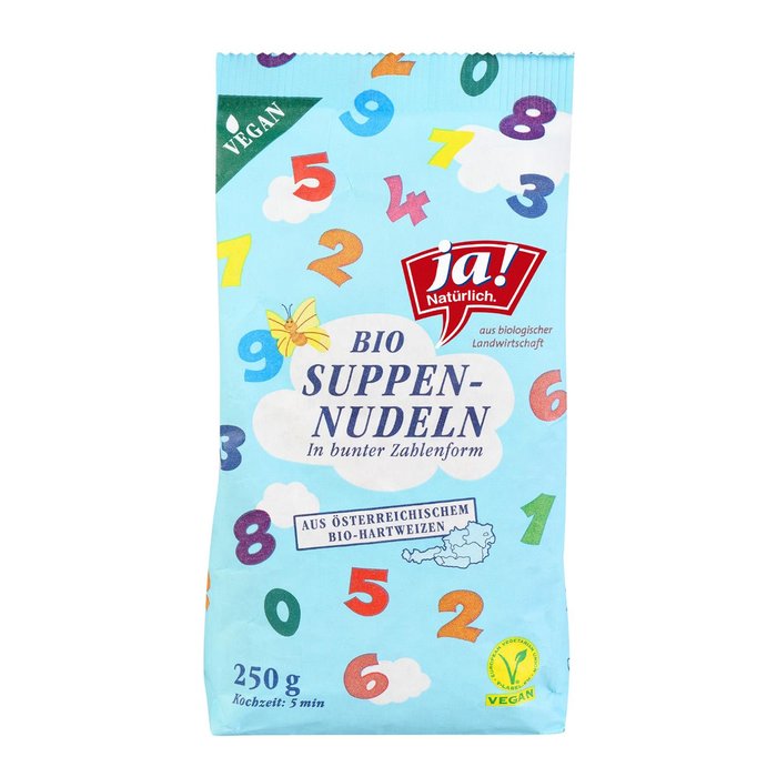 Zur Herstellung der Ja! Naturlich Bunten Suppennudeln in Zahlenform wird Hartweizen aus biologischer Landwirtschaft verwendet. Der Hartweizen wird extra schonend zu Grieß vermahlen und mit Wasser vermischt. Der entstandene Teig wird gepresst und anschließend getrocknet. Die rote und grune Farbe erhalten die Nudeln ausschließlich durch die Zugabe von 100% biologischem Paradeiser- bzw. Spinatpulver. Die Nudeln konnen mit der Suppe ihrer Wahl mitgekocht werden. Nach 8 Minuten haben sie die optimale Konsistenz.