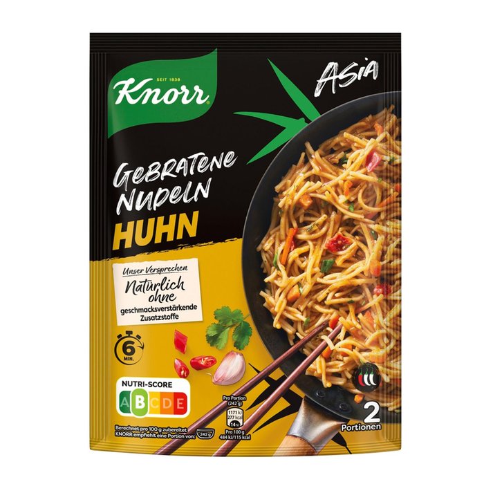 So einfach geht's in der Pfanne: 1) 450 ml Wasser erwärmen. Beutelinhalt einrühren und zum Kochen bringen. 2) Bei mittlerer Hitze ohne Deckel ca. 3 Minuten kochen lassen. Ab und zu umrühren. 3) 1 EL Rapsöl zugeben und die Nudeln rundherum ca. 2-3 Minuten anbraten.
