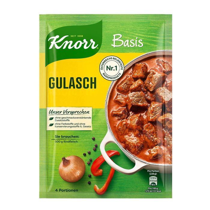 Was Sie dazu brauchen: 500 g Rindfleischwürfel (Wadschinken, Schulter) und 3 EL Öl Zubereitung: 1) Beutelinhalt in ¾ l (750 ml) warmes Wasser einrühren, 3 EL Öl dazu geben und aufkochen lassen. 2) Fleischwürfel beimengen. Halb zugedeckt 1½-2 Stunden weich dünsten. Evtl. etwas Wasser nachgießen. Öfter gut umrühren. 3) Nach Belieben Sauce mit Mehl oder Fix-Einbrenn binden. Bei Zubereitung im Druckkochtopf nur 375 ml Wasser und 3 EL Öl nehmen. Nach Fleischbeigabe kurz aufkochen, Deckel schließen und ca. ½ Stunde bei schwacher Hitze dünsten. Wir empfehlen dazu Kartoffeln und Paprikagemüse.