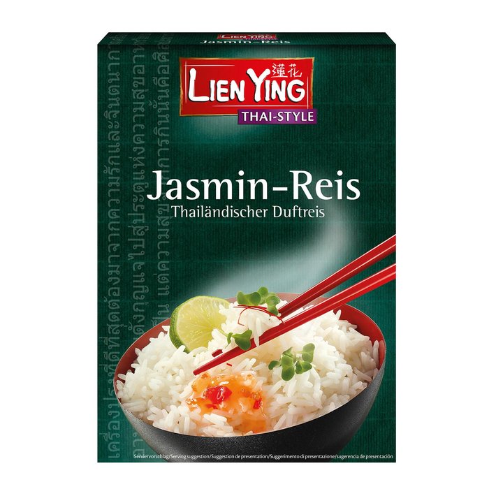 Zubereitung: 250 g Jasmin Reis waschen, in einen Topf geben und mit ½ l Wasser zum Kochen bringen. Ca. 15 Minuten abgedeckt auf kleinster Stufe quellen lassen, bis der Reis die Flüssigkeit aufgesogen hat.