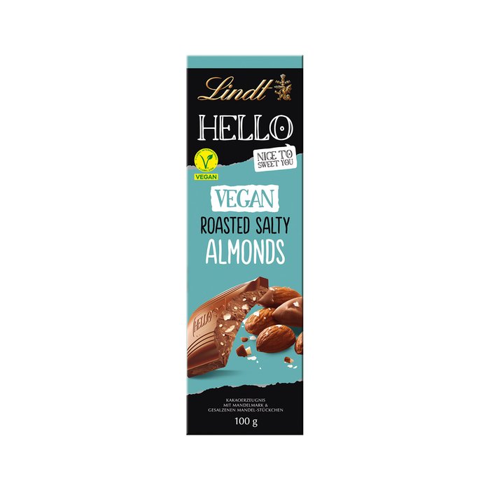 HELLO goes Vegan! Geröstete Mandelstückchen mit einem Hauch von Salz werden umhüllt von feinster Lindt-Chocolade auf Haferdrink-Basis und bieten ein unvergleichliches Geschmackserlebnis für Groß und Klein.